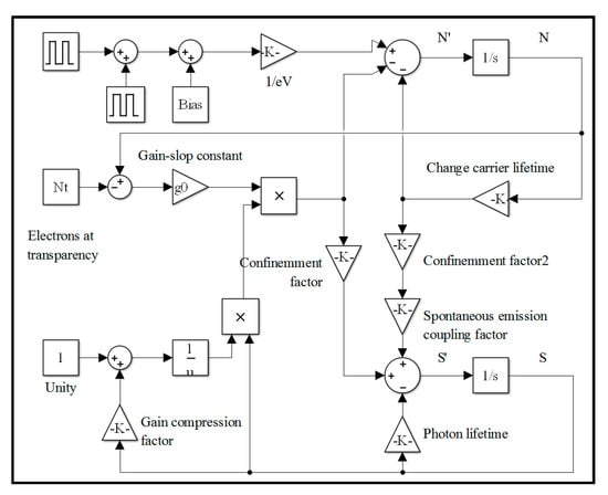 In order to analyze the effect of the parameter setting of the second stage modulated signal on the output light pulse, we establish the simulation models of single mode rate equations (Equations (1) and (2)) by SIMULINK, which is a visual simulation of MATLAB. To simulate the variation of the output pulse, we excite the semiconductor laser with a single current pulse. The amplitude of the first-stage modulation current is set to mA, and the width is ns, which is equal to the time of carrier density reaching the threshold for the first time. The bias current is set to 0 mA in order to get a high extinction ratio [23]. The block diagram of step modulation simulation is shown in Figure 2.