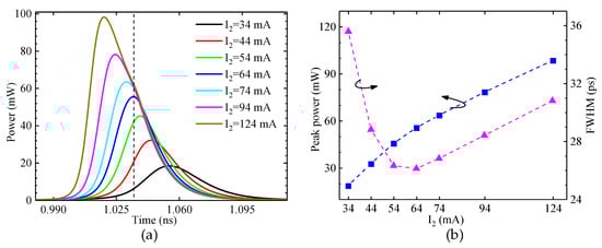 Simulation results of output pulses at different , when mA, ns, mA: (a) Time domain graph; (b) the peak power and full width at half maximum.