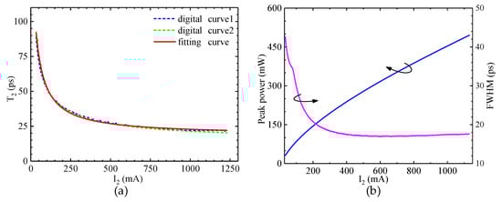 Figure 5b shows the variation of the peak power and the FWHM of the output pulse when and satisfy the relationship of Equation (4). According to the fitting curve in Figure 5a, it is directly seen that: To get a short pulse with high peak power, firstly, we can increase , and then reduce , so that the output pulse is more and sharper at the same peak power, until and satisfy the analogous expression of Equation (4); when increases indefinitely, changes slowly and tends to be stable. At this time, although the peak power is still increasing, the output pulse width changes very little and tends to stabilize too.