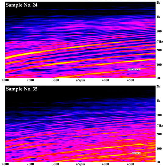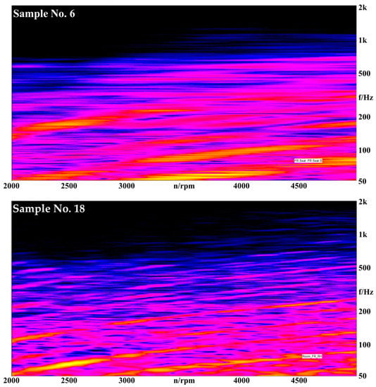 The results of the regression analysis show that different models were derived for each affective dimension. First, in the case of ‘Refined’, the optimal model considering the value of R2 is consist of SPL3500–5000, Sharpness2000–5000, Fluctuation2000–5000, and SPL-A3500–5000. It can be confirmed that the affective dimensions such as satisfaction and comfort for the engine acceleration sound are similar to which previous researches have predicted through the psychoacoustic parameter [32]. In addition, the value of the standardized beta of sharpness in the entire RPM range was larger than other parameters. Kwon et al. [50] found that the psychoacoustic parameters describing the sporty sound are loudness and sharpness. They validated that sharpness had a negative effect on sound quality, and this study, too, confirmed it by obtaining the same results. In order to compare the high value of perceived refined and a low one, spectrum analysis was performed (See Figure 5). It was established that the distribution of order is different. The sample with high perceived refined is clear in the main order and the value of SPL in the other areas is small. On the other hand, samples with low perceived refined had high SPL values in the entire RPM area and had many numbers of main orders. Therefore, it is necessary to consider additional variables related to the order of the engine sound as well as psychoacoustic parameters.
