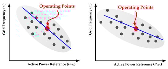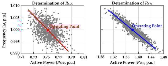 In this section, we derive the droop coefficients of LCC and VSC HVDCs by graphical analysis. Figure 1 shows a concept of the proposed method of droop coefficient determination. Red points are operating points of LCC and VSC HVDCs determined by the optimization problem. Grey dots represent optimization results of the Monte Carlo samples. The points are categorized by active power reference and grid frequency, so that the frequency–power droop can be represented by the slope of the blue line, to minimize the root mean square error between the points above the blue line and the grey dots. The slopes of the blue lines are presented as −RVSC,0 for VSC HVDC and −RLCC,0 for the LCC HVDC. Note that the determination method is called the “graphic method”, in that curve-fitting is exploited for coefficient determination.