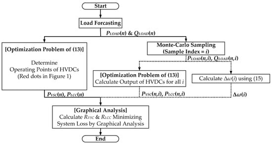 Figure 2 shows the overall procedure of the proposed method. First, the operating points of multiple HVDCs are derived from the forecasted load and scheduled output of generators using Equation (11). The Monte Carlo sampling method extracts irregular load profiles, and the active power references and frequency deviation for all samples are calculated by the samples. Note that the flow of multiple scenarios is represented by a dotted line. Finally, using the graphical approach described in Figure 1, the frequency–power droop coefficients of VSC HVDCs and LCC HVDCs are determined.