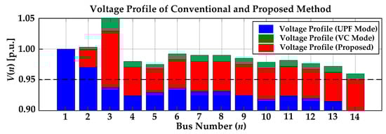 Voltage profile of the conventional and proposed methods in the IEEE 14-bus test system.