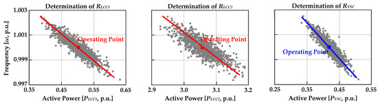 To verify the droop coefficient determination method, we generate 10,000 load profiles reflecting forecasting error. We assume that the active and reactive load profile follows the normal distribution function, in which the average is the forecasted value and the standard deviation is 3% of the forecasted value. According to a previous study [21], we define Req and D as 0.1 and 2, respectively. Figure 6 illustrates the graphical analysis of the frequency–power droop coefficient design methodology. As the optimization results are scattered as grey dots in Figure 6, we can define the droop coefficients of LCC and VSC HVDCs—RLCC and RVSC, respectively—like their corresponding lines.