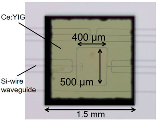 Microscopic image of fabricated MZI isolator on a silicon-on-insulator (SOI) platform. A 1.5-mm square die of cerium-substituted-YIG (Ce:YIG)/substituted-GGG is directly bonded on the Si waveguide. Two MZI arms are separated 500-µm away to apply external magnetic field in anti-parallel directions with a permanent magnet.