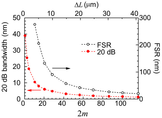 Although the MZI isolator was designed at a specific center wavelength, phase differences of MZI had a wavelength dependence. Typically, refractive indices of materials and MO effect decreased as wavelength became longer. The phase differences and decreased as well. Then, an MZI had a resonant spectrum with periods of in- and out-of-phase, the so-called free-spectral range (FSR). When a FSR was wider, the MZI isolator provided a higher isolation for the wider wavelength range. The integer m in Equation (2) determined the resonant period, and was designed by . Figure 3 shows the relation between m and 20 dB isolation bandwidth. Smaller m and shorter achieved a wider bandwidth, while it needed a precise fabrication of waveguide dimensions. Figure 4 shows measured transmission spectra of an MZI isolator fabricated with the length of 3.7 µm, which corresponds to m = 5. An optical isolation over 20 dB was obtained at 8-nm wavelength range. The transmittance included ~20 dB coupling loss between the fiber and waveguide for two facets by edge coupling. The insertion loss of 13 dB was mainly due to the scattering and reflection at Ce:YIG and air cladding regions’ boundaries.