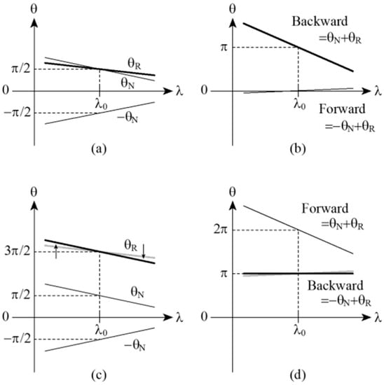Wavelength dependence of nonreciprocal and reciprocal phase differences, θN and θR, respectively, of MZI isolator with (a,b) conventional design and (c,d) wideband design.