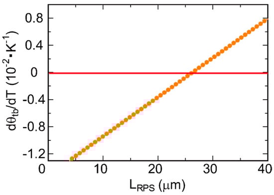 Calculated temperature dependence of the total phase difference on the length of reciprocal phase shift LRPS. Red line indicates the point to be zero.