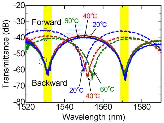 where k is the wave number. An MZI was designed so that these temperature dependencies cancelled each other in the backward operation. Figure 6 shows the calculated temperature dependence of the total phase difference in an MZI as a function of . They were plotted in dots because had to satisfy Equation (2) for integer m. It was found that the temperature dependence of total phase difference was zero at a specific . To verify the concept, MZI isolators having several were fabricated and characterized by changing the substrate’s temperature. Figure 7 shows the measured transmission spectra of an isolator with = 20.51 µm. In the forward direction, the spectra changed due to the temperature change. However, in the backward direction, only slight changes were observed in a temperature range of 20–60 °C. The difference in from that predicted in Figure 6 is owing to some dimensional errors in the fabrication process and possible differences between the actual optical properties used in the calculation.