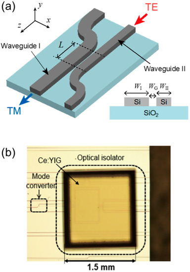 (a) Transverse electric (TE)–transverse magnetic (TM) mode converter consisting of two parallel waveguides. (b) Microscopic image of fabricated MZI optical isolator integrated with mode converter.