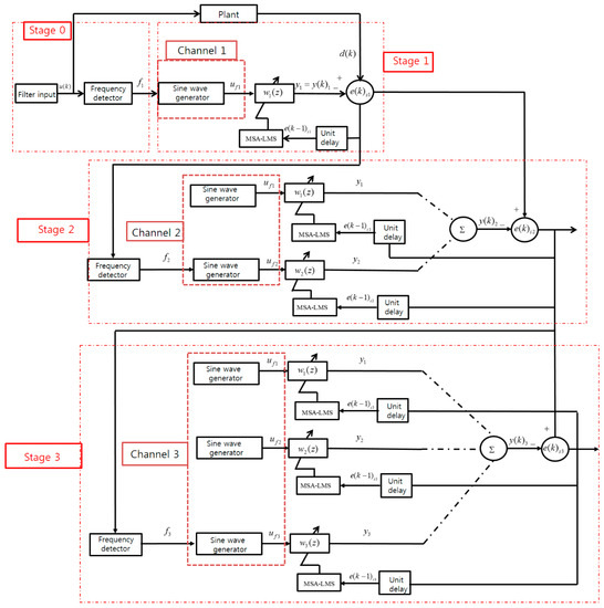 (2) Proposed MSA-LMS algorithm with multi-stage structure: According to the characteristics of the LMS algorithm, the signal after the control has a different spectrum to that of the original signal, which means that the number of frequency elements continues to increase. Furthermore, the conventional adaptive filtering system has a structure composed of the same reference signal and control system regardless of the time when one reference signal is determined, and consequently, the spillover phenomenon caused by the control deteriorates. To minimize this phenomenon, we proposed a new algorithm with several stages at regular intervals. This control strategy was also implemented by applying it to active periodic structures. The multi-stage architecture with multi-channel algorithms has the potential to actively attenuate vibration and noise signals with complex spectra in motors and decelerators used in next-generation powertrains for automobiles, aircrafts, and ships.