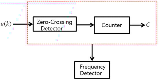 Stage 0 has a frequency detector. There are various methods of frequency estimation using a digital signal processor (DSP). The frequency is estimated by counting the number of times a given signal crosses the x-axis in one cycle of period through a detector, and then by substituting and into the equation below. The process can be illustrated by Figure 3 [13].