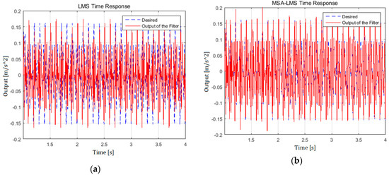 Figure 11 compares the estimation error of the active vibration control between the two algorithms. It can be observed that there was no significant difference up to 2 s. However, between 2 and 3 s, the maximum and minimum values of the control error were 0.1712 and −0.1835, respectively, for the LMS algorithm, while the corresponding values were 0.1305 and −0.059 for the MSA-LMS algorithm. Similarly, between 3 and 3.5 s, the respective values were 0.1701 and −0.1839 for LMS, while 0.0453 and −0.0178 for MSA-LMS. Finally, between 3.5 and 4 s, the respective values were 0.1712 and −0.1858 for LMS, while 0.0651 and −0.0199 for MSA-LMS.