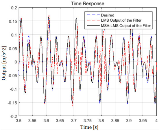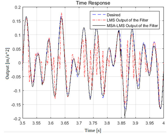 To compare the tracking performance between the LMS algorithm and the proposed MSA-LMS algorithm in detail, the interval from 3.5 to 4 s was enlarged, as shown in Figure 5. In the case of the LMS algorithm, it can be observed that the tracking performance for the desired signal was significantly lowered from the second-high peak to the low peak near 3.55 s. Furthermore, the direction was completely reversed in the middle of a vibration signal, which may have caused a spillover phenomenon with a higher frequency component than the original signal. On the other hand, in the case of the MSA-LMS algorithm using an energy autocorrelation function of instantaneous error, the misadjustment was found to be properly adjusted and the tracking performance was excellent.