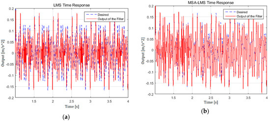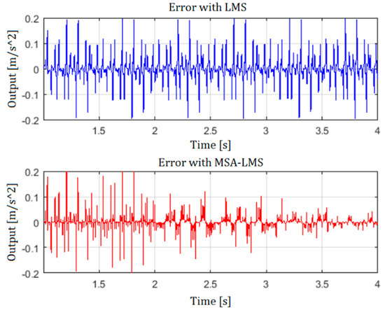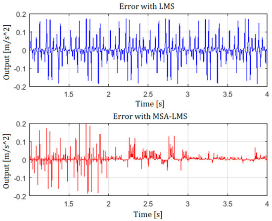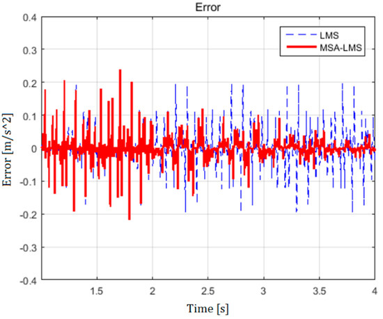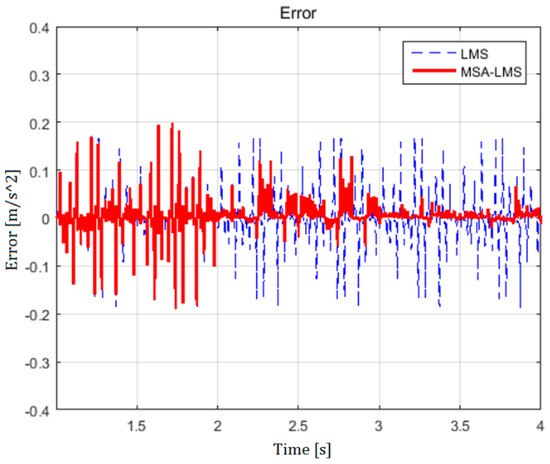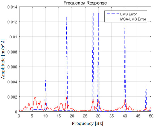 Figure 6 compares the estimation error of the active vibration control between the two algorithms. It can be observed that both algorithms exhibited almost the same values of error up to 2 s. However, between 2 and 3 s, the maximum and minimum values of the control error were 0.1963 and −0.1915, respectively, for the LMS algorithm, while 0.1176 and −0.1456 for the MSA-LMS algorithm. Similarly, between 3 and 3.5 s, the respective values were 0.1941 and −0.1917 for LMS, while 0.0928 and −0.0622 for MSA-LMS. Finally, between 3.5 and 4 s, the respective values were 0.1930 and 0.1946 for LMS, while 0.0558 and 0.0393 for MSA-LMS.