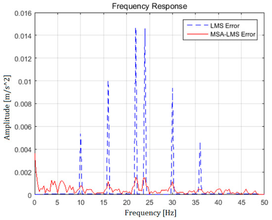 Figure 13 is a graph comparing the frequency spectra between the LMS algorithm and the proposed MSA-LMS algorithm. The main peaks at , , and for the MSA-LMS algorithm were found to be decreased by 8 dB, compared with the LMS algorithm, but the spillover phenomenon in the broadband was slightly increased for the MSA-LMS algorithm. It is thought that this phenomenon occurs as the frequency component increases with the stage and is attributed to the characteristics of the multi-stage structure of the algorithm.