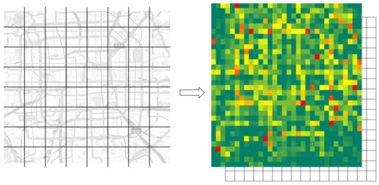 Our datasets are Beijing transportation smart card data from 3 August 2015 to 30 August 2015, which contain about 177 million records of passengers’ bus transaction information. Each record contains the following key attributes: card id, bus route id, bus vehicle code, boarding and alighting time, latitude and longitude coordinates of boarding and alighting stations. We divided the metropolitan area of Beijing into grids, and each grid represents a region. The size of each region is 0.625 km × 0.625 km, and the time interval is set to half an hour. We filtered out night buses as there are quite few of them and the traffic flow is extremely small, then using Definition 1 we obtained bus boarding flow and alighting flow from 6:00 to 22:00 every day. The average and the max traffic flow of all regions were 87 and 3497, respectively. We choose the last four days as the test data and all date before that as the training data.
