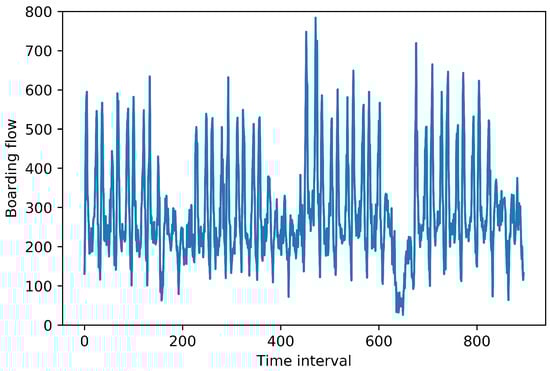 Figure 3 shows one week’s boarding flow in a region, that is the flow of each 30 min from 6:00 to 22:00 every day of one week. The region is located in the Beijing Central Business District, which is one of the busiest areas of Beijing. From the figure, we can find that there are two boarding-flow peaks every day during the weekday, and the boarding-flow curve is smoother during the weekend. Thus, there are obvious daily periodicity patterns. Figure 4 shows boarding flow in the same region of different time intervals, which is from 6:00 on 3 August 2015 to 22:00 on 30 August 2015. There are 896 time intervals. We can find that its period is 224 time intervals, i.e., one week. These all indicate that bus traffic flow has specific scenario patterns.
