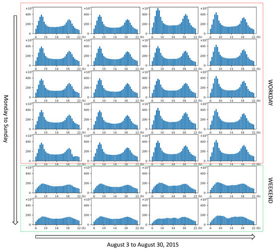 Figure 5 presents total bus traffic flow of all regions at each time interval. Each subgraph in the figure represents the total traffic flow of one day, which is the sum of bus alighting flow and boarding flow in all regions at each time interval. The horizontal coordinate in each subgraph represents different time intervals from 6:00 to 22:00, and the vertical coordinate in each subgraph represents the total traffic flow of the current time interval. There are a total of 28 subgraphs, representing 28 days from 3 August 2015 to 30 August 2015. The seven subgraphs of each column in the figure are all from Monday to Sunday.