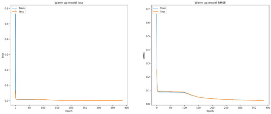 We trained our model in two stages. In the first stage, we split our training data into a 90% training set and 10% validation set, then we warmed up the training with 500 epochs, using early-stop methods to stop training when the validation metric stopped decreasing. Figure 7 presents the warm-up training, which shows the change of loss value and normalized RMSE value in each epoch, respectively. From the figure, we find that our proposed methods are very easy to train, and the training curves are close to the validation curves. After about 400 epochs, the training process was stopped, which showed that the validation metrics had stopped decreasing. In this way, we got the selected best model on the validation set. In the second stage, we continued training on all training data with another fixed number of epochs, e.g., 1000 epochs, using the selected best model. The learning rate was set to 0.0001. We used the Mean Squared Error as our loss function.