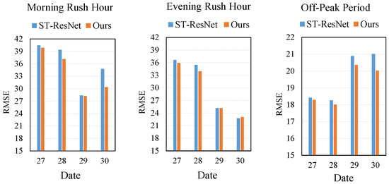 We further compared our proposed method with ST-ResNet during the rush hour period and off-peak period of the last four test days, that is from 27 August 2015 to 30 August 2015. As a result of the space limitation, we only show RMSE here, though we got the same conclusion of MAE. Figure 8 shows RMSE between ST-ResNet and our proposed method in rush hour (7:30–9:30), evening rush hour (17:00–19:00), and the off-peak period (12:00–14:00), respectively. From the figure, we can see that our proposed method has a lower RMSE compared with ST-ResNet, which shows that our proposed method has a better ability for bus traffic flow prediction in different periods. Moreover, we can see that prediction during rush hour is generally worse than the off-peak period. We believe that this is because the average value of traffic flow in rush hour is much larger than that of the off-peak period, e.g., 150 and 69 during rush hour and off-peak period, respectively. Because 27 August and 28 August are weekdays, and 29 August and 30 August are weekends, we can find that the prediction on weekdays are worse than weekends during rush hour, which we believe is because the average value of traffic flow on weekdays is larger than weekends, e.g., 123 and 82, respectively. However, the predictions on weekdays are better than weekends during the off-peak period; we think this is because the patterns are less regular on weekend.