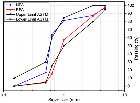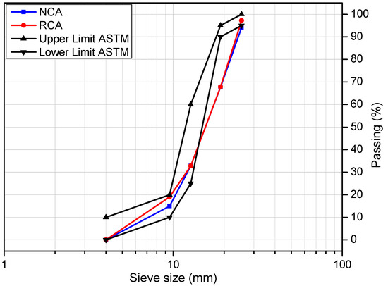 - Replacement of RA by natural aggregates (NA) considering the effect of the difference in density or distribution of particle sizes. In this sense, some researchers have tried to obtain “identical” granulometric profiles, for example, which makes it possible to avoid this variable being imputable in the change of the properties studied. However, this technological requirement in industrial practice on a large scale is obviously unacceptable because of the costs involved in dividing the aggregates into fractions of sizes and then recomposing the ideal profile again. Regarding changes in density, there are experimental procedures that allow separating the old mortar fraction from the old natural aggregate, thus allowing the RA to have densities equivalent to those of an NA (but with an equally complicated industrial practice).