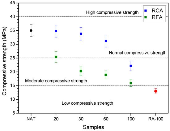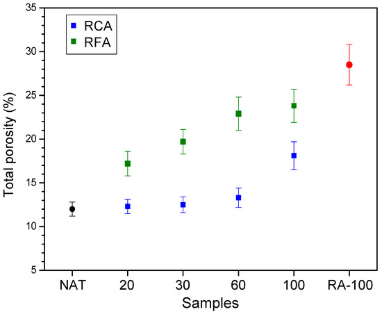 - The use of 30% or lower amounts of RCA does not significantly influence on total porosity and compressive strength. After 30% of RCA in the mixture, the total porosity increases and compressive strength decreases significantly.
