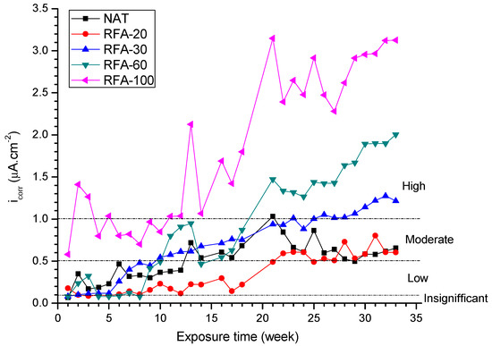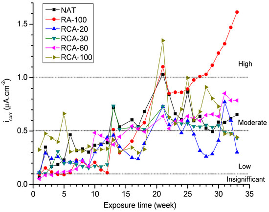- The corrosion of steel in conventional concrete and RAC accelerates with time. The more RA the RAC contains, the more rapidly the steel corrodes.
