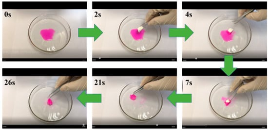 As shown in Figure 1, the APMP aerogels were effective for RB waste dye adsorption owing to their porosity and wettability []. The RB dye containing water was absorbed within a few seconds when in contact with a piece of aerogel at ambient temperature. Our RB absorption testing showed that 0.1 g of the APMP fiber aerogels could absorb 5 mL of high concentration RB waste (5 g L−1), which reflects the excellent absorption of RB waste (250 mg g−1). As shown in Table 1, the dye adsorption capacity is higher than many materials such as MoS2, jute stick powder, and kaolinite; however, it is lower than that of some types of activated carbon. Nevertheless, the adsorption rate of our aerogel is particularly fast, which indicates that APMP fiber aerogels are an excellent candidate for dealing with RB waste pollution.