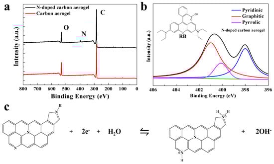 The chemical structures of RB contain heteroatom N compounds, making them excellent precursors for preparing doped heteroatom carbon aerogels. To demonstrate that the heteroatom N was bound to the structure and not combusted during high-temperature carbonation, we confirmed the compositions of the carbon and N-doped carbon aerogels by XPS analysis. The C 1s peak (284.3 eV) and O 1s peak (532.2 eV) were clearly visible in the spectra (Figure 3a). The atomic percentage of C was 86.82 at.% and that of O was 13.18 at.%. The N-doped carbon aerogel showed three peaks assignable to C 1s (284.4 eV), N 1s (400.7 eV), and O 1s (532.2 eV). The atomic percentages of C, N, and O in the N-doped carbon aerogel were 86.92 at.%, 2.15 at.%, and 10.93 at.%, respectively. Thus, N was successfully doped into the carbon aerogel skeleton. Furthermore, as shown in the fitted N 1s spectra of the N-doped carbon aerogel (Figure 3b), the N 1s spectrum was fitted by three peaks, namely pyridinic N (398 ± 0.2 eV), graphitic N (401.2 ± 0.2 eV), and pyrrolic N (400.5 ± 0.2 eV), while pyridinic N and pyrrolic N were considered as the main contributors to the pseudocapacitance, based on the Faraday reaction and according to previous reports []. For example, pyridinic N and pyrrolic N could produce pseudocapacitive effects in KOH aqueous electrolyte, associated with the proton-involved redox processes, as shown in Figure 3c. Thus, the porous N-doped carbon aerogels are expected to have good electrochemical properties. Furthermore, doping heteroatom nitrogen is a promising strategy to further tailor the chemical properties of sp2 carbon materials, which can efficiently improve the wettability of the interface between the electrodes and electrolytes, resulting in a considerable increase in the accessible surface area of the electrolyte. In addition, the presence of N can also promote electron transfer reactions and consequently enhance the whole capacitive performance of the supercapacitors [].
