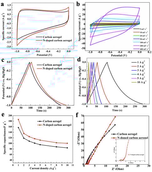 Figure 5e exhibits the specific capacitances of the carbon aerogel and N-doped carbon aerogel calculated from the galvanostatic discharge data. At the same current density from 1 to 10 A g−1, the N-doped carbon aerogel showed a higher specific capacitance. For example, the N-doped carbon aerogel possessed a specific capacitance of 185.8 F g−1 at 1 A g−1, which was higher than the values for the carbon aerogel (155 F g−1 at 1 A g−1), and the specific capacitance of the N-doped carbon aerogel at 10 A g−1 remained 105 F g−1, while the carbon aerogel only showed capacities of 84 F g−1, suggesting the beneficial effects of the N heteroatoms doped into the carbon aerogels. Moreover, a specific capacitance of 105 F g−1 was maintained for the N-doped carbon aerogel at 10 A g−1, which demonstrates good performance stability. Furthermore, the specific capacitance of the N-doped carbon aerogel was higher than other N-doped carbon materials, such as heteroatom-doped carbon nanofiber aerogels (171.2 F g−1, 0.5 A g−1) [], sulfur and nitrogen dual-doping carbon materials (170 F g−1, 1 A g−1) [], and KOH-activated carbon aerogels (152.6 F g−1, 0.5 A g−1) [].