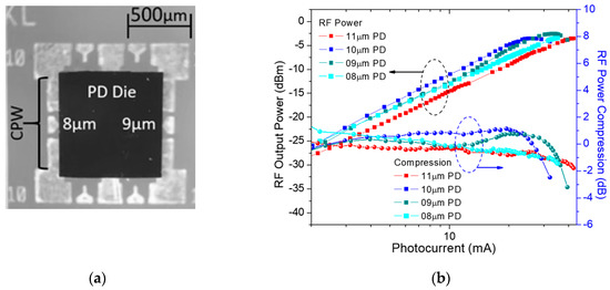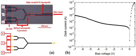 Lack of material versatility limits the design freedom of epi-layers in monolithic Ge-on-Si PDs. To mitigate this drawback, PD arrays have been proposed. In [49], 8 Ge PDs were connected in a traveling-wave fashion and the optical signal was fed from both sides of the active region in order to enhance the power handling capability. In ref. [50], four Ge PDs were connected in parallel in a compact array to enhance the RF output power. The optical image and schematic of the PD array are shown in Figure 13a. The device layout was designed using the AIM Si photonics Process Design Kit (PDK) [51]. Three optical waveguide Y-junctions were used to equally split the input optical power to feed the four PDs. The outputs of the PDs were connected in parallel to the shared ground-signal-ground (GSG) pad on the top dielectric layer through vias. The device was fabricated on a multi project wafer run in AIM’s Si photonics foundry.
