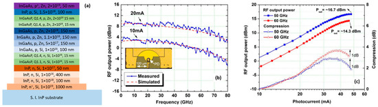 Figure 3a shows the epitaxial layer structure of the MUTC PD that was designed for 60 GHz [19]. It includes a 400-nm-thick 1 × 1016 cm−3 n-type doped drift layer and an InGaAs absorbing region with a total thickness of 500 nm. The transit-time limited component of the bandwidth was estimated to be 85 GHz. The measured bandwidth and saturation power of a 10-μm diameter PD (no antenna) are shown in Figure 3b,c. The PD had a 3-dB bandwidth of 60 GHz while the 1-dB RF saturation power reached 16.7 and 14.3 dBm at 50 and 60 GHz, respectively.