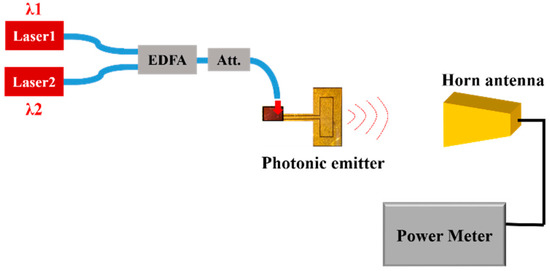 The radiated power of the integrated photodiode-antenna emitters was measured using the setup shown in Figure 5. The optical RF signal was generated using an optical heterodyne setup. The radiation power was received in the far field using a commercial horn antenna and measured by a RF power meter.