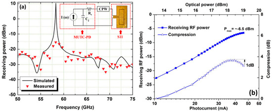 The received radiation power versus frequency is shown in Figure 6a. The power at 15 mA average photocurrent amounts to −15 to −35 dBm between 50 to 75 GHz. Also shown in Figure 6a is the simulated radiation power using the circuit model shown in the inset of Figure 6a. The received RF power was calculated using Friis’ Equation [21] based on the radiated power, gain of transmitting (4.5 dBi) and receiving (15 dBi) antennas, and free-space loss (−43 dB). The simulation and experimental results agree with each other. The radiation power at 60 GHz versus the photocurrent is shown in Figure 6b. The 1-dB RF saturation power is −6.5 dBm at −5 V and 45 mA photocurrent. Using Friis’ equation, the effective radiated power is 20 dBm. According to the IEEE 802.16 standard [22], a minimum power of −46.2 dBm is required at the receiver for a QPSK-modulated signal at 60 GHz, which should be possible once a 25-dBi receiving antenna in 15 m distance from the integrated photodiode-antenna emitter is used.