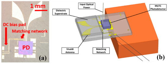 - Moody, J.; Sun, K.; Li, Q.; Beling, A.; Bowers, S.M. A Vivaldi antenna based W-band MUTC photodiode driven radiator. In Proceedings of the IEEE International Topical Meeting on Microwave Photonics (MWP), Long Beach, CA, USA, 31 October–3 November 2016; pp. 217–220. [Google Scholar]