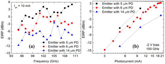 Devices with 5-, 6-, and 14-µm-diameter PDs were measured and their EIRP from 95 to 110 GHz are shown in Figure 10a. Photonic emitters with 5- and 6-µm-diameter PDs reached higher EIRP than the photonic emitter with the 14-µm-diameter PD, which can be explained by the larger PD junction capacitance and poor impedance matching. The photonic emitter with 5-µm-diameter PD reached 5 dBm at 110 GHz, and the -6-dB bandwidth for all three photonic emitters was 10 GHz. The fact that the EIRP varies across the measured frequency range might result from the varying impedance matching condition. The EIRP at 100 GHz as a function of photocurrent is shown in Figure 10b.
