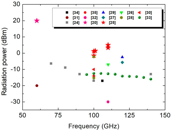 Figure 11 gives an overview of the radiation power of photonic emitters from 50 to 150 GHz that have been reported in the literature. In [26,27,28], a horn antenna with high directional gain was connected to the PDs. In refs. [27,29,30,31,32,33], either a Teflon or Si lens was used to improve the directional gain of the antenna. Planar antenna structures include Yagi [34,35], bow-tie [18,24], and slot [29,35], however, impedance matching between PD and antenna was not reported for these structures. In contrast, the integrated photonic emitters reported in refs. [23,25] have planar structures and include an impedance matching network. Due to the high-power handling capability of the MUTC PD, these integrated photodiode-antenna emitters have the highest radiation power, both, at 60 GHz, and 100 GHz.