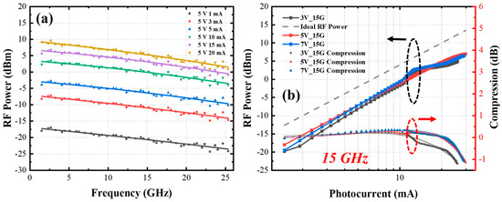 The frequency response of the PD array was measured at −5 V bias at various photocurrents from 1 mA to 20 mA. The results are shown in Figure 14a. The 3-dB bandwidth is 15 GHz up to a photocurrent of 15 mA and remains as high as 12 GHz at 20 mA photocurrent. The RF output power of the PD array was measured at the 3-dB bandwidth frequency under different reverse voltages. As shown in Figure 14b, the RF power increases with reverse voltage and begins to saturate above −5 V bias. The RF power and the saturation current at 1-dB compression are 7 dBm and 19 mA, respectively, under −7 V at 15 GHz.