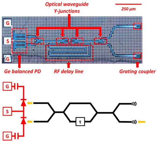 In order to demonstrate the applicability of a Ge-on-Si PD array in a microwave photonics application, a balanced PD pair integrated with a Mach-Zehnder delay line interferometer (MZ DLI) was used to demodulate and detect a phase-modulated signal in an analog photonic link. The optical image and the schematic of the integrated receiver are shown in Figure 15. The optical input signal is fed through one of the vertical grating couplers and then split by a Y-junction. One arm includes a 1.4 mm-long silicon waveguide to delay the optical signal by 25 ps to allow for interferometric demodulation of the phase modulated signal. The demodulator worked at the quadrature point by adjusting the laser wavelength.