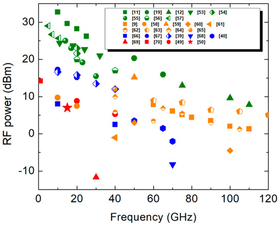 RF output power versus frequency of PDs for high-power analog applications reported in the literature. Green: normal-incidence PDs on native InP substrate; orange: waveguide PDs on native InP substrate; blue: integrated III-V waveguide PDs on Si; red: integrated Ge waveguide PDs on Si [9,11,12,19,39,40,49,50,53,54,55,56,57,58,59,60,61,62,63,64,65,66,67,68,69,70].
