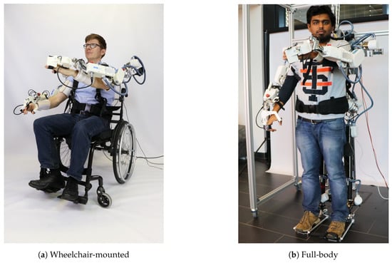In this paper, we present the electro-mechanical design aspects and evaluation results of the bilateral Recupera exoskeleton (Figure 1). It is designed to support the therapy of patients with hemiparetic motor impairments of the upper body after stroke. The system has been developed in close collaboration between engineers, therapists and neurobiologists to support the patient and therapist in an optimal way. Due to novel mechanisms, embedded processing and an advanced control architecture, it can provide a set of different therapy modes and exercise possibilities in clinical or ambulatory therapy or even the private environment. The lightweight design and modularity allows to use the system in different configurations, e.g., (1) as a 10 DOF upper body wheelchair-mounted part system (Figure 1a) or (2) as a 30 DOF full-body system (Figure 1b) with legs to support sitting and standing postures. The wheelchair system is designed to support the hemiparetic stroke patients who are usually bounded to a wheelchair in their early days after stroke. Once they start to recover, they can continue training with the full body exoskeleton system which provides them the possibility to perform upper body exercises while both sitting and standing. Both systems are designed such that the patient does not have to carry the weight of the exoskeleton as the weight of the system is compensated by the controller and transferred to the ground. Furthermore, the mobility of the patient is not compromised. Due to its bilateral design, the system can be used with both left and right sided stroke patients and can provide extended training possibilities e.g., dual arm tasks, and mirror therapy. In the previous work from the authors, the first CAD design ideas of this system were introduced in [36] and detailed analysis of various subsystem modules used in the design were presented in [37,38,39,40]. This paper focuses on the mechatronic design aspects and the control architecture of the commissioned system and presents the experimental results on its rehabilitative aspects. Non-rehabilitative control aspects of the full body configuration such as active balancing, walking etc. will be addressed in future work.
