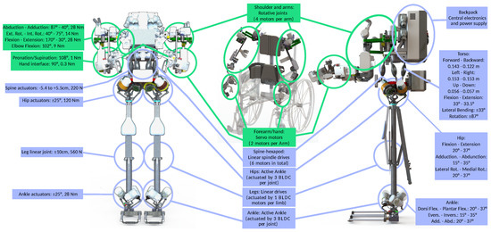 Recupera exoskeleton configurations (left and right: full-body, middle: wheelchair) with its ROM and force/torque capabilities. Modules highlighted in green are used in both systems, mechanisms highlighted in blue only in the fullbody system. Full-body system (weight = 42 kg, height = 1.70–1.90 m) is driven by 28 brush-less direct current (BLDC) and 4 servo motors. Wheelchair system (weight = 8.6 kg, 29.2 kg including commercial wheelchair) is driven by 8 BLDC and 4 servo motors.