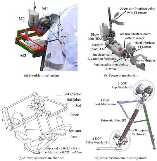 Hip and ankle joints are designed as 3 DOF orientational joints in the exoskeleton. Here, a novel almost spherical parallel mechanism (ASPM), also known as Active Ankle, has been invented [37,38,43,44]. In mechanism theory, it is typical to identify parallel mechanisms using their type (for details, see [45]). In this convention, different letters denote the joint type (R for revolute, P for prismatic, S for spherical etc.) and the underlined letter shows the active joint. The mechanical type of ASPM is 3-[R-[2-SS]] as depicted in Figure 3c featuring three rotative actuators fixed to the base. Each of the three motors drives a spatial quadrilateral consisting of a symmetric crank, two rods, and a line segment on the mobile platform. The mechanism’s homogeneous and simple design leads to a low link diversity, permits a low-cost construction, and provides robustness against production inaccuracies. A crucial feature of the mechanism’s design is the stress distribution among the structure. The six rods that transmit the forces from the cranks to the platform are only loaded with forces along their axes due to the spherical joints attached to them. Moreover, any force applied along the direction of the platform’s torsional axis can be supported without an active torque in the motors.