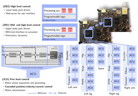Hybrid centralized-decentralized control and network architecture. The exoskeleton is controlled by two central systems, called ZynqBrain (ZB), and a network of decentralized Actuator Control Units (ACU) for BLDC motor control. Each motor is controlled locally by an adjacent ACU. The distributed ACUs are interconnected via an NDLCom network. ACUs that belong to a specific limb form a subsystem. Bottom left: cascaded actuator-level control architecture implemented on the FPGA of each ACU; u is the angular position, is the angular velocity and i is the motor current. The reference values are provided by the mid-level control on the ZBs. All ACUs continuously send telemetry status data including u, and i to ZB1 with a frequency of 100 Hz using the NDLCom network.
