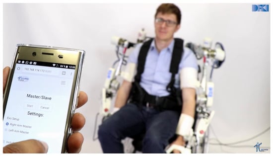 The first robotic systems for stroke rehabilitation have already been developed in the 1990s [21,22], followed by first commercial systems [23]. Since then, the technological capabilities of the systems have been increased significantly [16]. Different survey studies have shown that robots can provide significant advantages over classical stroke therapy [24,25]. Exoskeletons can be used for different parts of the body [17]. For instance, systems for the lower extremities such as the ReWalk [26] system are used for gait rehabilitation, or hand systems are used for gripping tasks [27]. However, in this paper, we focus on rehabilitation applications of the upper extremities. Most exoskeletons for upper body rehabilitation [28] are heavy and bulky, and, hence, attached to a fixed base or heavy mobile platforms (e.g., ARMIN III [29], ARMEO [30], HARMONY [31]). This either reduces the mobility of patients or forces the patient to carry the weight of the exoskeleton (e.g., RUPERT [32]) which might be problematic for patients with reduced trunk stability. Accordingly, the use of these systems is limited to clinical applications, where patients can practice exercises only with the supervision of a therapist. Lightweight exoskeletons with at least 5 degrees of freedom (DOF) which do not compromise with patient’s mobility are sparsely reported (e.g., SUEFUL-6 [33]). Since clinical resources and especially therapist time are limited, it is often not possible to offer more frequent or longer therapy sessions. To make the exoskeleton technology more pervasive in the patient’s life, it is important to develop lightweight exoskeletons with high safety assurance that provide possibilities for self-training (such as mirror therapy [34] or teach and replay [35]) so that the total therapy time can be increased. Another important development trend is the development of bilateral systems (e.g., HARMONY [31]) to extend therapy options.
