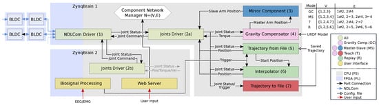 The mid and high level control is implemented using the Robot Construction Kit (Rock) [55] which is based on the component model of the Orocos Real Time Toolkit (RTT) and the object request broker (ORB) implementation, omniORB. Components (or tasks) encapsulate different functionalities, run independently and provide input and output for other components (see Figure 10). The configuration can be applied to each component individually. This allows adjustments to the system in a very flexible way and to distribute computational demanding components among the two ZynqBrains. Additionally, a web server is running on the second ZynqBrain providing access to a web application written in JavaScript and provides a user interface for the therapist or patient, e.g., to select a mode, adjust settings or observe the current state of the exoskeleton (see Section 3.2.3). Furthermore, some functionalities can be triggered by biosignals like EEG or EMG as the biosignal processing can be done on the embedded processors [36,50].