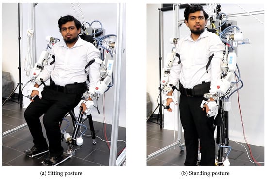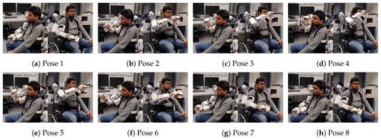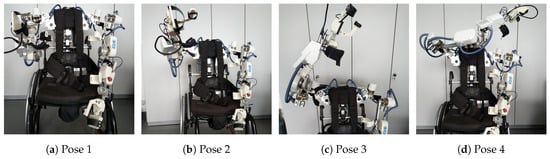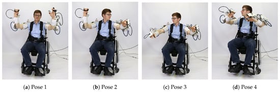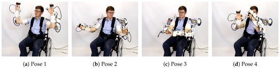 A good gravity compensation model is crucial to ensure transparency of the exoskeleton to the human subject and ease of operation for the therapist. Table 3 shows average commanded torque (predicted with inverse dynamic model i.e., Equation (6)), average measured torque (through motor current), mean absolute error (MAE) in joint space and norm of MAE for a duration of 10 s sampled at 100 Hz for four balanced poses (guided by hand) of the right arm as shown in Figure 11. It can be observed that for all poses, norm of MAE is between Nm & 0.26 Nm which demonstrates the good quality of the model. Figure 12 shows four different poses during the dual arm gravity compensation mode with the human subject inside the exoskeleton. Due to the good quality of the gravity compensation model, the human subject can move its arms freely within the system (also see Multimedia attachments). Optionally, human arm weight compensation can also be included in the model. Another application of this functionality is the get in helper mode (see Figure 13) which allows easy entry of the human subject inside the exoskeleton system. Thanks to the transparent behaviour of the exoskeleton arms in this mode, the human subject can wear them in a safe and user-friendly manner. Healthy subjects can enter the dual arm exoskeleton in less than a minute on average provided no passive adjustments in the system are to be done.