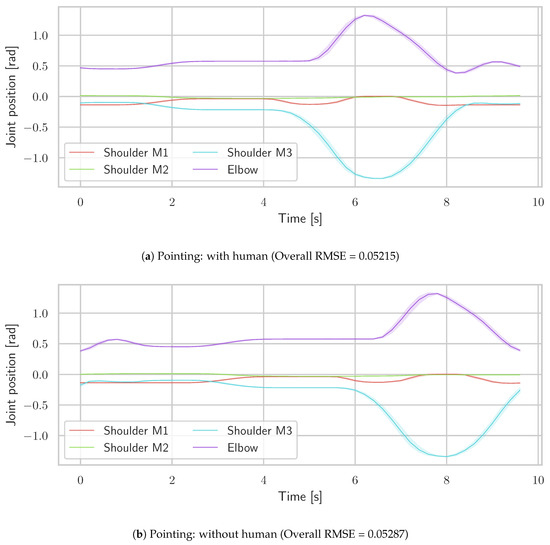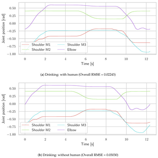To demonstrate Teach & Replay therapy, drinking and pointing trajectories were taught to the system and were replayed ten times with and without human subject. Figure 14 and Figure 15 show the error band plots between the commanded trajectories and joint status recorded from the exoskeleton and also notes the root mean square error (RMSE) for the two taught movements. It can be observed that the system performs better in the presence of a human subject as the human body acts as a damper to the small vibrations occuring due to structural flexibilities. Figure 16 shows the motion sequence during the drinking movement with a human subject inside the exoskeleton system.
