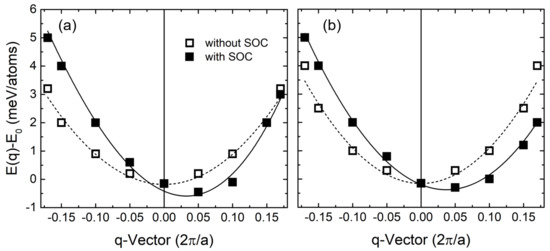 Total energy E(q) is calculated along the paths of - and - which have the highest symmetry among other directions in the two-dimensional Brillouin zone (2D BZ). E(q) with and without SOC [28] are separately displayed in Figure 1. In the 2D BZ, we characterize spin spiral phase using the wave vector q with a constant angle of , where is defined as q·R.